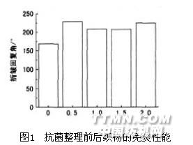 (1) 一浴法 二浸二軋( 80℃×30 min,軋余率80% ) →預烘(80℃×5 min)→焙烘(160℃×3 min)究其在棉織物上的抗菌效果。