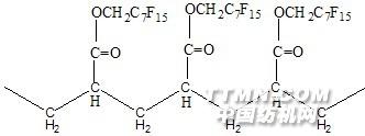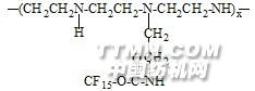 用FC-208整理的織物具有良好的防水防油性能,但當織物再污染以后,這些油垢不僅不能脫落,而且洗液中已分散的油性污垢又會重新沾附到織物上,即易于再污染。為了改進全氟丙烯酸酯的這種缺點,大量的研究時設法賦予全氟化合物以親水性。有的將乙烯亞胺與全氟化合物反應,合成高防油性及中等防水性的化合物,有的使乙基全氟辛酸酯與聚乙烯亞胺側鏈上的伯胺基反應,生成物的化學結構如下: