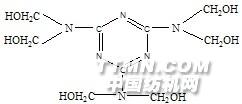 三聚氰胺很易和甲醛反應(yīng),非環(huán)氮原子上的氫原子被羥甲基取代,生成六羥甲基三聚氰胺,很大數(shù)量上用在“洗可穿”整理中。六羥甲基三聚氰胺樹脂初縮體的穩(wěn)定性較高,在中性水溶液中可保持?jǐn)?shù)天,在織物上的整理效果持久性強(qiáng),是棉織物使用的重要樹脂整理劑。甲醚化羥基甲基三聚氰胺樹脂MMM(Methoxy methylmelamine),是用甲醇進(jìn)行醚化改性的羥甲基三聚氰胺樹脂初縮體。甲醚化三羥基甲基三聚氰胺MTMM樹脂,結(jié)構(gòu)為: