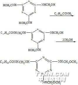 甲醚化羥基甲基三聚氰胺樹脂的耐洗滌性比相應(yīng)的未甲醚化的羥甲基三聚氰胺更好一些,在水中的溶解度和穩(wěn)定性都有所提高,對織物的強(qiáng)降和泛黃都有提高,缺點(diǎn)是手感較硬。為了改善手感,將甲醚化三羥甲基三聚氰胺用脂肪酰胺進(jìn)一步改性。.jpg)