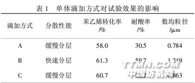 2結(jié)果與討論2.1包囊化效果的影響因素 2.1.1單體苯乙烯與丙烯酸的滴加方式 在250 mL四口燒瓶中加入超細(xì)碳酸鈣5.0 g,按 3種不同的滴加方式分別滴加引發(fā)劑0.11 g,苯乙烯+ 丙烯酸3.0 g,蒸餾水100 mL,在80℃和1 200 r/min轉(zhuǎn) 速下恒溫反應(yīng)8 h.三種不同的滴加方式如下:A先將 全部單體(St+AA)加入到反應(yīng)容器中,然后滴加用100 mL蒸餾水溶解的過(guò)硫酸銨;B先將100 mL蒸餾水溶 解的引發(fā)劑過(guò)硫酸銨全部加入到反應(yīng)容器中,然后滴 加單體(St+AA);C先將100 mL蒸餾水全部加入到反 應(yīng)容器中,然后滴加已溶解的(St+AA)-過(guò)硫酸銨混合 溶液.表1表明,三種滴定方式對(duì)單體苯乙烯的轉(zhuǎn)化率 影響不大,而耐酸效果則是滴定方式B較A、C兩種方 式好,從數(shù)均粒徑和分散性能可得到印證.原因是在 滴定方式B中,首先加入的引發(fā)劑水溶液在CaCO3粉 末表面產(chǎn)生反應(yīng)活性點(diǎn),隨聚合時(shí)間的延長(zhǎng),單體逐漸在CaCO3顆粒表面發(fā)生包囊化反應(yīng)并逐漸對(duì)其產(chǎn) 生包覆作用,因此生成的顆粒粒徑相對(duì)較大,由于重 力作用靜置后很容易出現(xiàn)分層現(xiàn)象.
