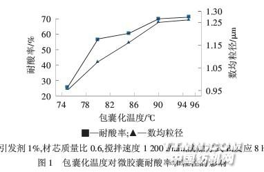 2.1.2包囊化溫度圖1是溫度對(duì)苯乙烯原位聚合的超細(xì)CaCO3顆 粒微膠囊(以下簡(jiǎn)稱(chēng)