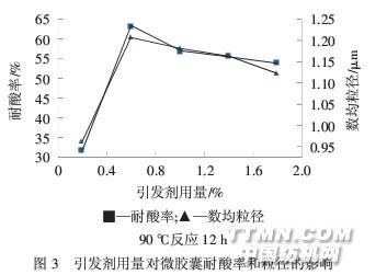 圖2顯示,隨著聚合時(shí)間的延長(zhǎng),微膠囊粒徑不斷變大.包囊化12 h左右,耐酸率得到很大提高,顆粒 粒徑增加較小,而12 h后,顆粒粒徑增加很大,耐酸率 反而變化不明顯.原因是反應(yīng)初期生成的聚苯乙烯核 一方面吸收單體、引發(fā)劑和自由基在粒子相中聚合, 另一方面逐漸聚合在碳酸鈣粒子表面,使包覆在碳酸 鈣表面的聚苯乙烯膜厚度變大,形成的膜更致密,隨著 聚合時(shí)間的延長(zhǎng),改性后的碳酸鈣耐酸率逐漸提高.因 此,包囊化時(shí)間以12 h為宜.2.1.4引發(fā)劑用量由圖3可看出,當(dāng)引發(fā)劑用量過(guò)低時(shí),單體轉(zhuǎn)化 率很低,生成的聚合物對(duì)碳酸鈣粒子的包覆率較低,表 現(xiàn)為碳酸鈣粒子的耐酸率也較低;隨著引發(fā)劑用量增 加,碳酸鈣粒子的數(shù)均粒徑增大,耐酸率升高,原因是 引發(fā)劑用量增加,自由基生成速率相應(yīng)增大,數(shù)目增 多,粒子碰撞概率增多,轉(zhuǎn)化率增大,引發(fā)劑用量為0.6% 時(shí)耐酸率最大;超過(guò)0.6%后,生成的自由基增多,會(huì)導(dǎo) 致生成的聚合物分子質(zhì)量迅速下降,包覆后的碳酸鈣 顆粒耐酸率有所降低.因此,引發(fā)劑用量應(yīng)適宜,優(yōu)化 引發(fā)劑過(guò)硫酸銨的用量為0.6%(對(duì)CaCO3質(zhì)量).