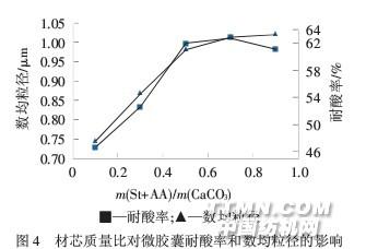 2.1.5材芯質(zhì)量比[m(St+AA)/m(CaCO3)] 由圖4可看出,隨著m(St+AA)/m(CaCO3)的增加, 碳酸鈣顆粒的耐酸率逐漸提高,而m(St+AA)/m(CaCO3) 超過(guò)0.7后,耐酸率有所下降.因?yàn)?/div>