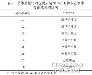 2.1.6單體丙烯酸與苯乙烯的質(zhì)量比 從表2可知,當(dāng)m(AA)/m(St)=0.4時(shí),改性后的超 細(xì)CaCO3粉末在水相中形成懸浮分散液,均勻分散于 水相中.因?yàn)閱误w丙烯酸具有親水性的羧基,而苯乙 烯是疏水性單體,在聚合過(guò)程中兩種單體的質(zhì)量比不 同,生成聚合物的親水性羧基含量發(fā)生對(duì)應(yīng)改變,隨著 丙烯酸單體含量的提高,聚合物的親水性有所提高. 在m(AA)/m(St)比值處于0.4~0.6時(shí),改性后的CaCO3 懸浮分散在水相中,出現(xiàn)分層現(xiàn)象但不明顯,說(shuō)明此 時(shí)苯乙烯-丙烯酸共聚物的親水親油性處于相對(duì)平 衡狀態(tài),當(dāng)m(AA)/m(St)大于0.6時(shí),包覆層表面完全被 水潤(rùn)濕,提高了顆粒的潤(rùn)濕性,從而分散現(xiàn)象很明顯.