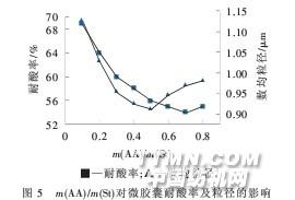 從圖5可知,在m(AA)/m(St)=0.5時(shí),數(shù)均粒徑達(dá) 到最小,此時(shí)耐酸率在56%左右,比m(AA)/m(St)=0.1 時(shí)減少了13%左右[m(AA)/m(St)=0.1時(shí),耐酸率為69%], 這進(jìn)一步印證了在制備微膠囊囊壁過(guò)程中,單體苯乙 烯用量是影響耐酸率的主要因素,在單體總質(zhì)量固定 時(shí),m(AA)/m(St)比值增大,則苯乙烯用