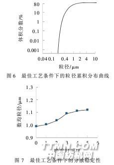 綜合親水性、分散效果、耐酸率、數(shù)均粒徑考慮, 選擇m(AA)/m(St)=0.5.2.2分散穩(wěn)定性將最佳工藝條件下獲得的粒徑在1μm左右、耐 酸率達(dá)到56%左右的碳酸鈣包囊化產(chǎn)品進(jìn)行分散穩(wěn) 定性試驗(yàn),顆粒粒徑累積分布曲線如圖6,分散穩(wěn)定性 結(jié)果如圖7所示.