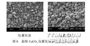 從圖6、7可看出,包囊化CaCO3粉體在水體系中 的分散穩(wěn)定性隨時(shí)間的變化不明顯,反映出體系一直 處于一種很好的穩(wěn)定狀態(tài).2.3包囊化前后超細(xì)CaCO3的形貌分析由圖8可以看到,原料CaCO3顆粒表面既不透明 也很粗糙,而包囊化后的樣品表面上有一層薄薄的半 透明膜,而且表面比原料CaCO3顆粒表面光滑,說(shuō)明通過(guò)原位乳液共聚包覆后,在CaCO3顆粒表面確實(shí)有 聚合物存在.