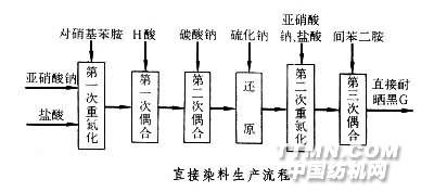 鈉,調節溶液呈堿性,使對硝基苯胺重氮鹽在H酸羥基的鄰位上進行第二次偶合,便得到雙偶氮染料。用硫化鈉使硝基還原成氨基,酸析過濾,濾餅溶解在碳酸鈉溶液中,再加入亞硝酸鈉,隨即加到鹽酸冰水溶液中去,用反加法進行第二次重氮化,生成的重氮鹽,再與間苯二胺進行第三次偶合,可得直接耐曬黑G(C.I.直接黑19)染料。