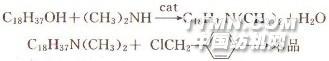 將十八胺、甲醛、甲酸、乙醇投入甲基化罐內進行甲基化反應,用氫氧化鈉中和過剩的甲酸,放掉廢液,用自來水洗至PH=7,經脫水得十八烷基二甲基胺(十八叔胺),壓至季胺化罐內,加入一定量的氯芐,在80℃一下反應半小時即可得成品。 新工藝是以十八醇和二甲胺為原料,先合成十八烷基二甲基胺即十八叔胺,然后再與氯化芐進行季銨化反應而制得成品1827。并且現已普遍采用新工藝,取代老工藝。 .jpg)