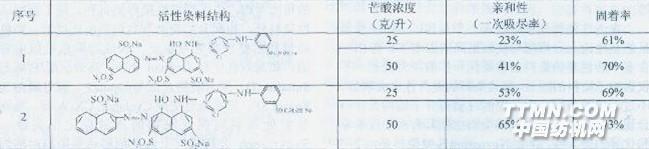 顯然染料#2對鹽的用量不敏感,由于它的親和力還比較大,因此它適用于低鹽染色。基于這種研究,若把一氯均三嗪活性基用于分子更小、反應小與乙烯砜活性基相近的一氟均三嗪活性基來取代,使活性染料分子結構的平面性更好,這樣染色時對鹽的敏感性就