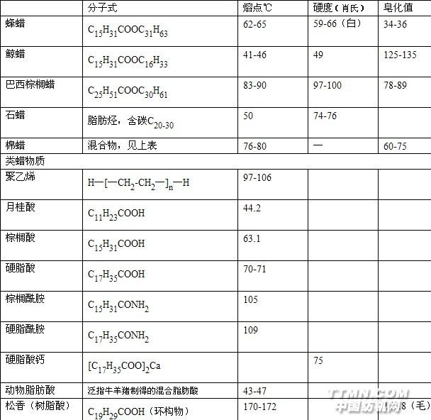 二.后整理用柔軟劑的種類(一)柔軟劑的原始材料——蠟與類蠟物質目前,常用柔軟劑原料的蠟與類蠟物質的物理性質如下[2][3].jpg)