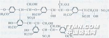 陳榮圻 2、分散劑 分散劑對活性染料溶解度有較大影響,如何根據染料結構選擇好分散劑對提高活性染料水溶性有很大幫助。由于活性染料分子的特殊性,分散染料所用的分散劑不能滿足其要求。根據國外研究結果并用于活性染料商品的分散劑有兩類,為木質素磺酸和萘磺酸甲醛縮合物。 (1)木質素磺酸銨 對于某些溶解度差的偶氫型活性染料,通過原染料的研磨和標準化與木質素磺酸銨拼混可得到溶解度大幅提高的商品染料。 木質素磺酸鹽是由多個4-羥基-3-甲氧基苯丙烷的羥基和磺酸基的聚合物,平均分子是為8000~13000,它的分子結構尚未完成確定,下式為木質素磺的大分子的部份結構式: