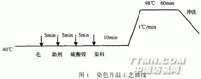 0 引 言 用羊毛活性染料染羊毛有許多優點.近年來,毛用活性染料及其染色技術的研究發展很快,如Lanasol、Hostalan、Drimalan等染料在羊毛染色中已享有較高的聲譽[1]].上海萬得化工公司新研制了一套毛用活性染料系列Megalan,本文中研究用釋酸劑調節染色pH值,考查對上染率和固色率的影響,從而制定相應的染色工藝. 酸在羊毛染色中起相當大的作用,能很好的控制染料上染速率.在羊毛染色過程中,如果能加入一種能控制染色pH值的助劑(釋酸劑),染色pH值從6~7起染.這樣不但能促使染料理想分布和獲得良好的遷移效果,而且隨著時間推移和溫度升高,釋酸劑放出大量的酸,使染浴pH值緩慢降低,染色速度因而加快,吸盡更好,得到較高的固色率.這樣,即可解決傳統染色中,中途加酸,工藝復雜,時間過長,染色不易控制的缺點,又可避免由于采用游離酸帶來的弊病. 本文中討論染色工藝pH值為可變浴的新染色體系,采用易分解的硫酸銨,使染浴的pH值隨時間的推移和溫度的升高而持續均勻地變化,即由高pH值的上染條件,逐漸變為低pH值的染色條件,從而實現良好的勻染,得到較高的固色率,減輕羊毛的損傷.