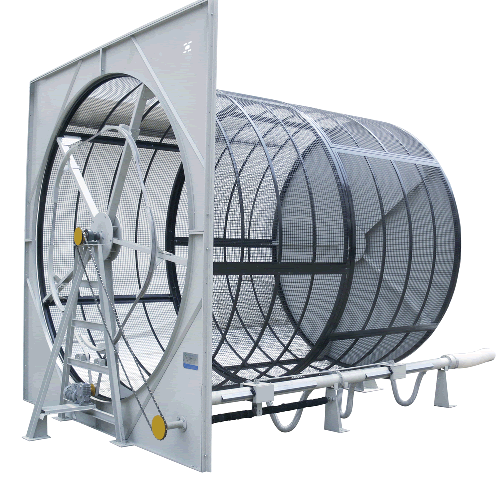 含塵空氣從轉籠外向轉籠內流動,將其中的塵雜截留在過濾材料上,潔凈空氣則從轉籠內通過其敞開端流出墻板(或方箱)。墻板(或方箱)外有風機將潔凈空氣抽出。
