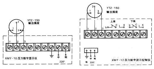 ■與二次儀表XMY-10壓力數(shù)字顯示儀及XMY-12壓力數(shù)字顯示控制儀(本廠生產(chǎn))配套的接線圖: