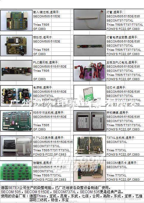 德國SETEX公司生產(chǎn)的染整電腦,已廣泛地被各染整設備制造廠使用。    SECOM 505,SECOM 515,SECOM 515DE,SECOM 737XL(早期型號:SC737XL),SECOM 535更是經(jīng)典產(chǎn)品。