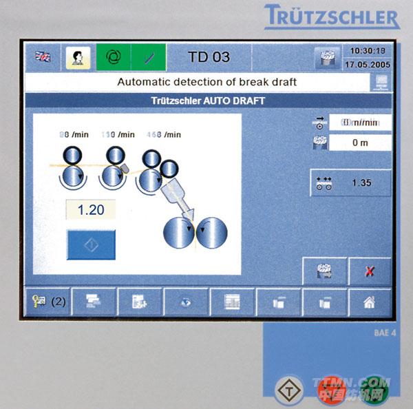 自動牽伸裝置AUTODRAFT是自調勻整并條機后區牽伸完全自動的自我優化功能。該系統在1分鐘內就能根據正在加工的物料給出最佳后區牽伸建議。AUTODRAFT可作為可選項安裝在并條機TD03上,但也可以卸除。