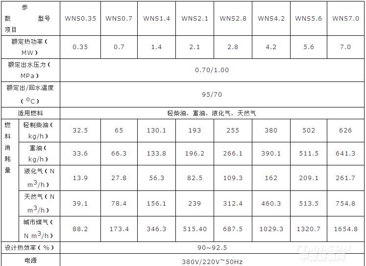 WNS系列承壓熱水鍋爐性能參數表