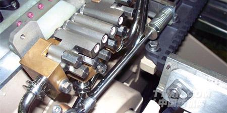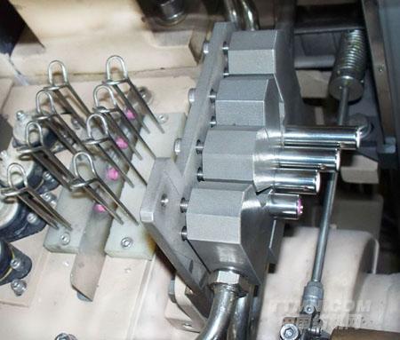 采用新型陶瓷噴嘴,進一步提高了噴射水的集束性,實現了較小開口和較小水量的穩定運轉,即使在高速運轉中也能夠有益于經紗和緯紗的軟引緯。最新型的雙集束噴嘴,縮短了噴嘴間距,減小第一和第二噴嘴的引緯狀態差異,實現均一化的引緯。此外通過導紗間隔片,抑制了鋼筘運動導致的氣流散亂,使引緯更加穩定。
