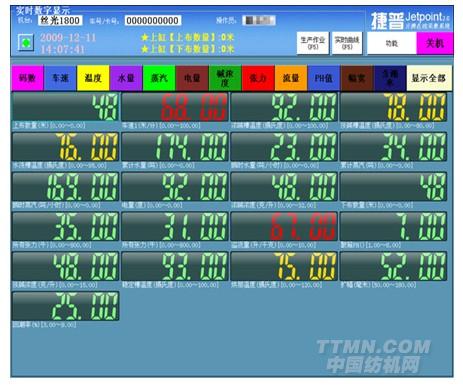 ①數(shù)據(jù)采集設(shè)備——對車間設(shè)備連接的參數(shù)傳感器進行數(shù)據(jù)采集,為現(xiàn)場監(jiān)控終端提供數(shù)據(jù)來源。采集設(shè)備主要包括:車速碼數(shù)采集模組、溫度采集模組、縫頭采集模組、門幅采集模組、含潮率采集模組以及能源(水、電、汽)數(shù)字儀表等。