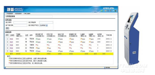(2)客戶自助終端——在樣品陳列室或客戶接待室,設(shè)置客戶自助查詢終端;或者在企業(yè)網(wǎng)站上開設(shè)查詢頁面,客戶可以通過自助查詢終端或互聯(lián)網(wǎng)查詢自己訂單的實時生產(chǎn)進度、查看成品的驗布報告、查看歷史訂單等。