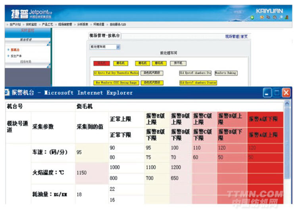 當(dāng)機臺異常運轉(zhuǎn)、工藝參數(shù)超過正常范圍時,系統(tǒng)將立即反應(yīng),通過聲光報警裝置提醒現(xiàn)場操作人員及時進行調(diào)整,同時通過網(wǎng)絡(luò)將異常情況發(fā)生的機臺和參數(shù),通報生產(chǎn)管理人員。