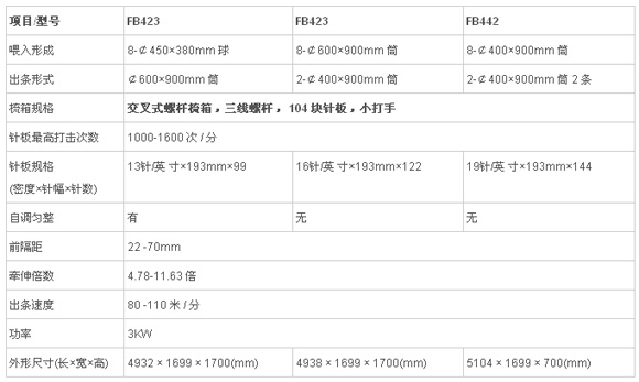 FB423 、 FB432 、 FB442 型針梳機是在廣泛聽取用戶意見,吸收進口機優點,結合國情自行設計開發的新型針梳機。該機由喂入組件、主機組件和輸出組件組成。 FB432 型針梳機配有機械式自調勻整裝置。三種機器的主機機架、前羅拉、梳箱及主傳動部件完全一致,通用性強、維修、操作方便。