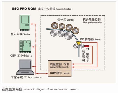 在線檢測功能(選用):本機可選用USTER? SLIVERGUARD PRO/第二代在線棉條質量管理系統。該系統可隨機統計1m,3m,10m的重量不勻率,及CV%,A%等,可隨時查看和記錄波譜圖,根據用戶需要選擇超標自停或者超標報警,并顯示停車原因或報警原因,從而有利于質量控制與分析,減少試驗工勞動強度。