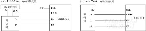 當(dāng)編碼器所需電流ICC〉50mA時(shí),需外加5V電源單獨(dú)給編碼器供電,同時(shí)需要保證編碼器和DCS303共地,如圖a)所示。