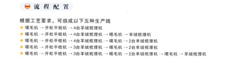 適用原料:山羊絨、駝毛絨、牦牛絨等天然原料,原料經過本流程后,將逐級被開松、去粗、除雜與數理,最后制成標準的無毛絨。
