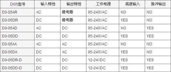 DL05系統(tǒng)PLC的I/O點(diǎn)數(shù)相同,為8如/6出,其外形尺寸也相同; 根據(jù)其I/O電氣特性的不同,目前可提供以下幾種型號(hào)的DL05PLC: