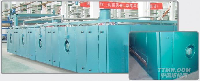進布有平進或斜進布兩種,烘房采用三層穿布,積木式設計,每室烘房有二只循環風機、四只散熱器,噴風由上、中、下三處同時直接噴向織物表面。