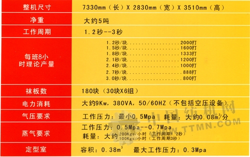 3、本機采用先進(jìn)的變頻原理,襪板的工作周期可根據(jù)定型工藝要求做任意調(diào)節(jié)。最短工作周期是1.2秒,最大產(chǎn)量每8小時班產(chǎn)量約2000打(按理論數(shù)據(jù)計算)。
