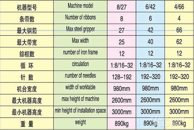 用 途:用于生產圖案,字符,文字等經提花效果的彈性或非彈性窄幅織物以及裝飾物。花型創建由320根和12片綜框控制。可生產各式彈性帶與非彈性帶類,例如胸圍帶,衣褲松緊帶,緞帶,拉鏈帶,鞋帶等,可廣泛用于成衣,帽子,發飾,禮品,醫療用品,皮帶,手套,雨衣,鞋類,照相機,手表,皮包等提花織帶。