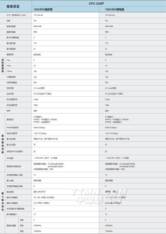 本機(jī)集成2個(gè)通訊口,其中1個(gè)為PPI,1個(gè)自由通信口(FPORT),內(nèi)部集成MODBUS協(xié)議,12DI/8DO,4AI,2AQ; 程序空間12KB,數(shù)據(jù)空間8KB,4路高速計(jì)數(shù)器輸入。